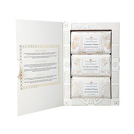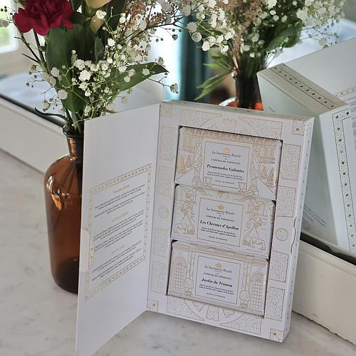 Ce coffret prestigieux est le fruit d’une collaboration entre La Savonnerie Royale et le Château de Versailles. Il réunit trois savons naturels de 100 g chacun, enrichis en beurre de karité bio, et inspirés des jardins et de l’art de vivre à la cour de Louis XIV. Chaque savon est orné d’une fleur de lys en relief, symbole royal, et présenté dans un écrin élégant fabriqué en France, reflet du savoir-faire artisanal et du patrimoine français.